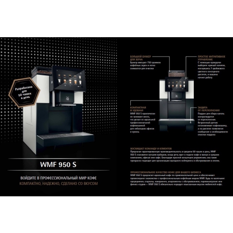 WMF 950 S практически не занимает места, что делает ее идеальной профессиональной кофемашиной для небольших офисов и кухонь