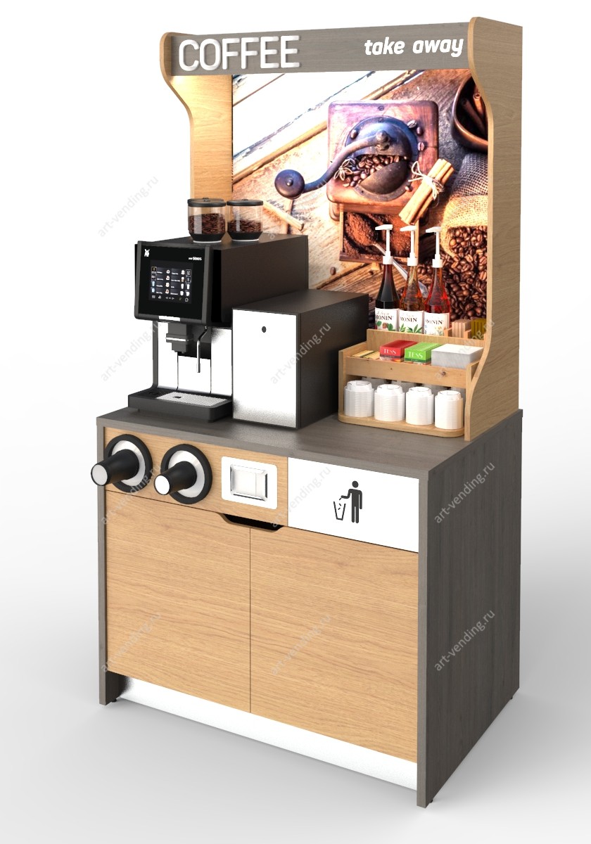 Кофейный модуль Робуста М3-3 идеально подойдет для размещения в бизнес-центре, спортивном клубе, холле гостиницы, в МФЦ или в любом другом учреждении, где необходим качественный кофесервис. Стильное цветовое решение хорошо привлекает покупателей. Продуманные детали, удобство использования и эргономика, высокое качество материалов и современные технологии исполнения. В комплект поставки входят тумба с надстройкой, козырьком и подсветкой, два встроенных диспенсера для стаканов и один диспенсер для салфеток, встроенный мусоропровод из нержавеющей стали с люком, гастроемкость, регулируемые опоры, технологические отверстия с декоративными заглушками для подвода воды и электричества, плинтус из нержавеющей стали, накопитель с распашными створками. Кофемашина, органайзер и аксессуары поставляются отдельно.