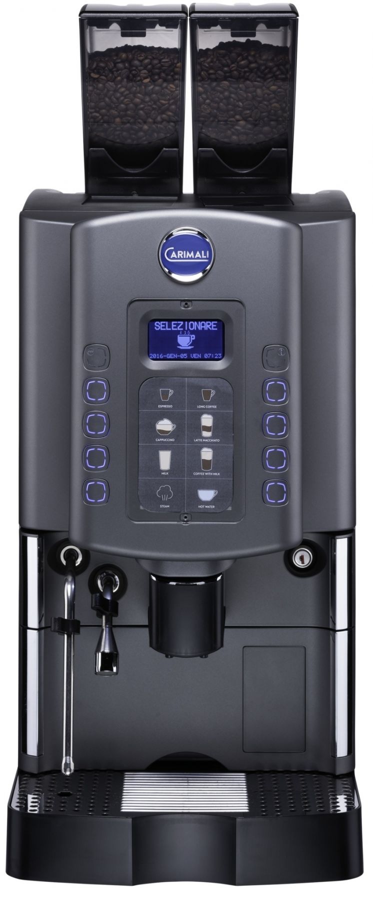 За счет большого монитора суперавтоматическая кофемашина Carimali Optima Soft выглядит очень современно. Фирменная голубая подсветка притягивает внимание клиента, а высокие прозрачные бункера для кофе и ингредиентов обеспечивают хороший визуальный контакт с натуральными кофейными зернами, что вызывает доверие к качеству напитка и стимулирует продажи. Кнопочное управление делает управление кофемашиной предельно простым и интуитивно понятным.