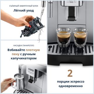 Сливочная молочная пена благодаря ручному капучинатору, 5 рецептов в одно касание, решетка, которую можно мыть в посудомоечной машине и съемный блок для заваривания в Delonghi ECAM290.31.SB