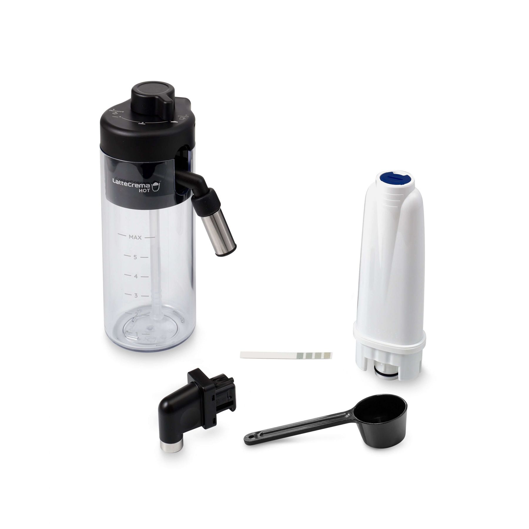 Комплектация: Кофемашина Съемный поддон для капель Узел подачи горячей воды Кувшин для молока (latte crema hot) Ложка-дозатор для молотого кофе Индикаторная полоска “Total Hardness Test”