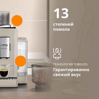 Погрузитесь в мир кофе вместе с De'Longhi Rivelia. Исследуйте бесконечное разнообразие зерен с помощью системы Bean Switch, наслаждайтесь захватывающими впечатлениями на 3,5-дюймовом цветном сенсорном экране с богатой анимацией и индивидуальными программами приготовления кофе. Создайте кремовую пену с помощью ручного капучинатора для молока в компактной машине, которая адаптируется к вашему стилю.