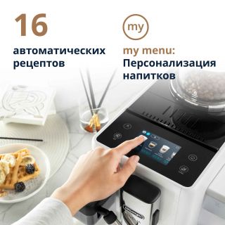 Интуитивно понятный цветной дисплей с диагональю 3,5 дюйма обеспечивает удобное управление всеми функциями кофемашины. Вы можете выбрать из 16 различных напитков всего лишь одним касанием.