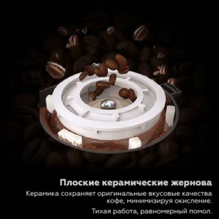 ■ Кофемолка с плоскими керамическими жерновами обеспечивает стабильный и однородный помол, сохраняя уникальный вкус и аромат кофе, не окисляет и не пережигает зерна при длительной работе.