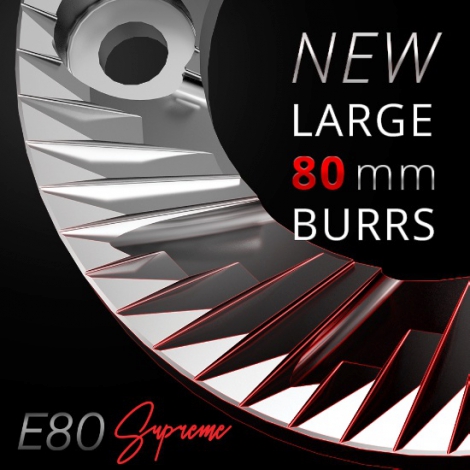 E80 Supreme определяет новый профессиональный уровень работы для кофемолок премиум класса. Она обеспечивает самую высокую скорость помола и производительность в своем классе и может легко справиться с огромными потоками в течение дня. Разработанный эксклюзивно дизайн и геометрия жерновов, отличное качество помола отвечают самым высоким требованиям и обеспечивают наилучший вкус. Запатентованная заводом новейшая технология DDD для определения расстояния между жерновами позволяет установить размер помола в точном соответствии с положением жерновов..Настройка помола под Ваши рецепты еще никогда не была такой простой и настолько точной.