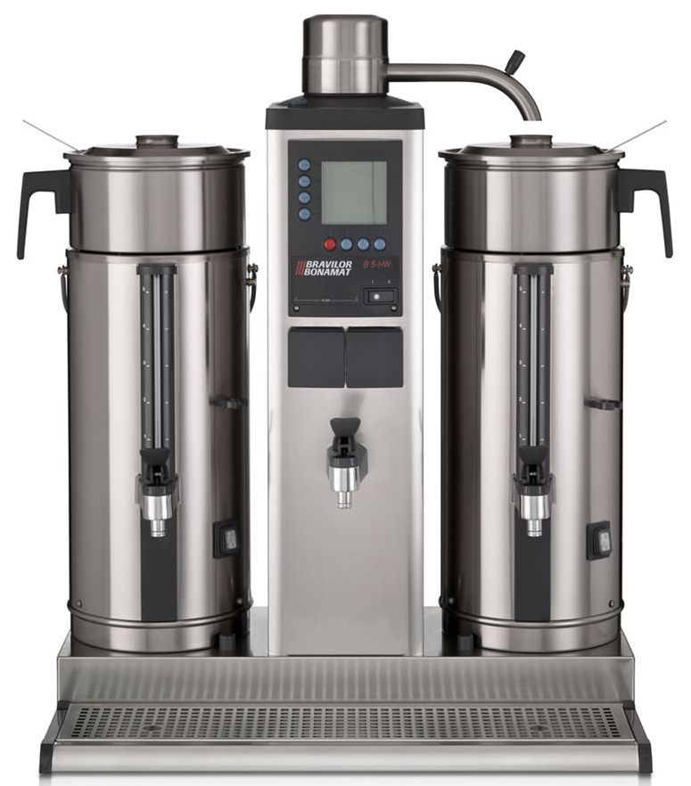 Кофе, приготовленный методом однократного пролива горячей воды через находящийся на фильтре слой молотого кофе, обладает особым ароматом и имеет своих приверженцев. Многие кофейни включают фильтр кофе в свое меню наряду с эспрессо и американо. Также такой подход в приготовлении кофе незаменим когда нужно быстро обслужить большой поток посетителей например завтраки в отелях, шведские столы на массовых мероприятиях, столовые в обеденный перерыв.  Кофемашина Bravilor Bonamat B5 HW - это круговая фильтр-машина для быстрого заваривания больших объемов кофе методом непрерывного пролива. Она оснащена одним заварочным устройством, двумя емкостями для кофе по 5 литров каждая, панелью с ЖК дисплеем, системой автоматического удаления накипи, счетчиками приготовленных порций, сигнализатором готовности кофе и встроенным таймером, а также отдельно выведенным краном горячей воды. Данная модель стационарно подключается к системе центрального водоснабжения. Идеально подходит для кейтеринга, гостиниц, кафе и столовых.