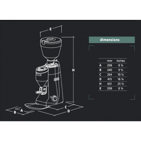 Профессиональная кофемолка с коническими жерновами, прямого помола с дозатором. Кофемолка оснащена электронной регулировкой помола, счетчиком чашек и емкостью для молотого кофе. Имеет защиту от перегрева. Конические ножи и медленная скорость вращения, подходит для баров со средним потреблением и рекомендована для измельчения изысканных смесей. Плавная микрометрическая регулировка помола. Помол по требованию. Электронная регулировка порции, одинарные и двойные порции с независимыми настройками. Цифровой дисплей со счётчиком порций. Вентиляционное охлаждение двигателя с электронным управлением.
