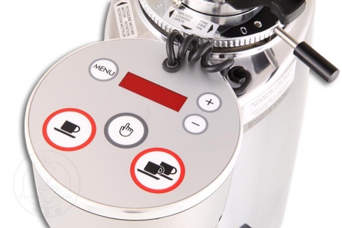 Кофемолка-дозатор с плоскими стальными жерновами диаметром 64 мм. Микрометрическая бесступенчатая регулировка помола. Система управления автоматическая после начала помола останавливается по заполнению дозатора, рассчитанного на 6 порций.