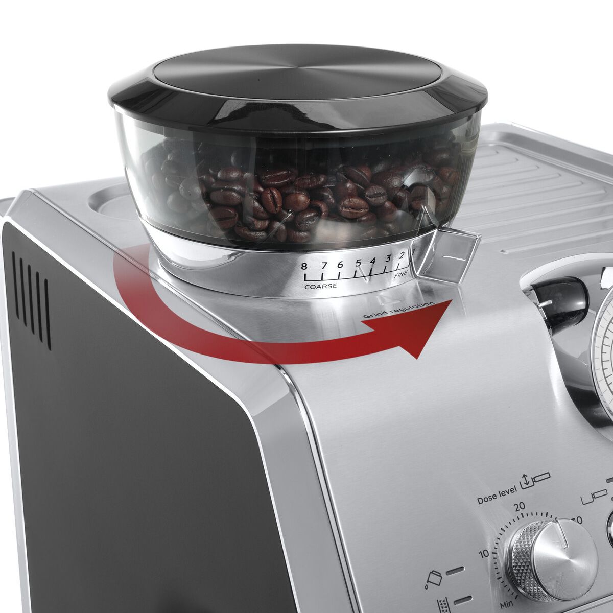 Кофеварка оборудована конической жерновой кофемолкой с восемью степенями помола – подбирайте в зависимости от ваших предпочтений. В боковой части корпуса расположена ручка-темпер, позволяющая прессовать кофе непосредственно в рожке. C системой Smart Tamping позволит вам всегда идеально темпировать молотый кофе и получать идеальный напиток.