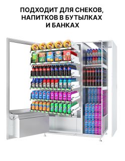 Внутри — до 60 гибко настраиваемых слотов с системой спиральной выдачи. Благодаря продуманной конструкции, можно легко менять ширину слотов и высоту полок, адаптируя автомат под любой товар от шоколадных батончиков до 0,5 л бутылок.